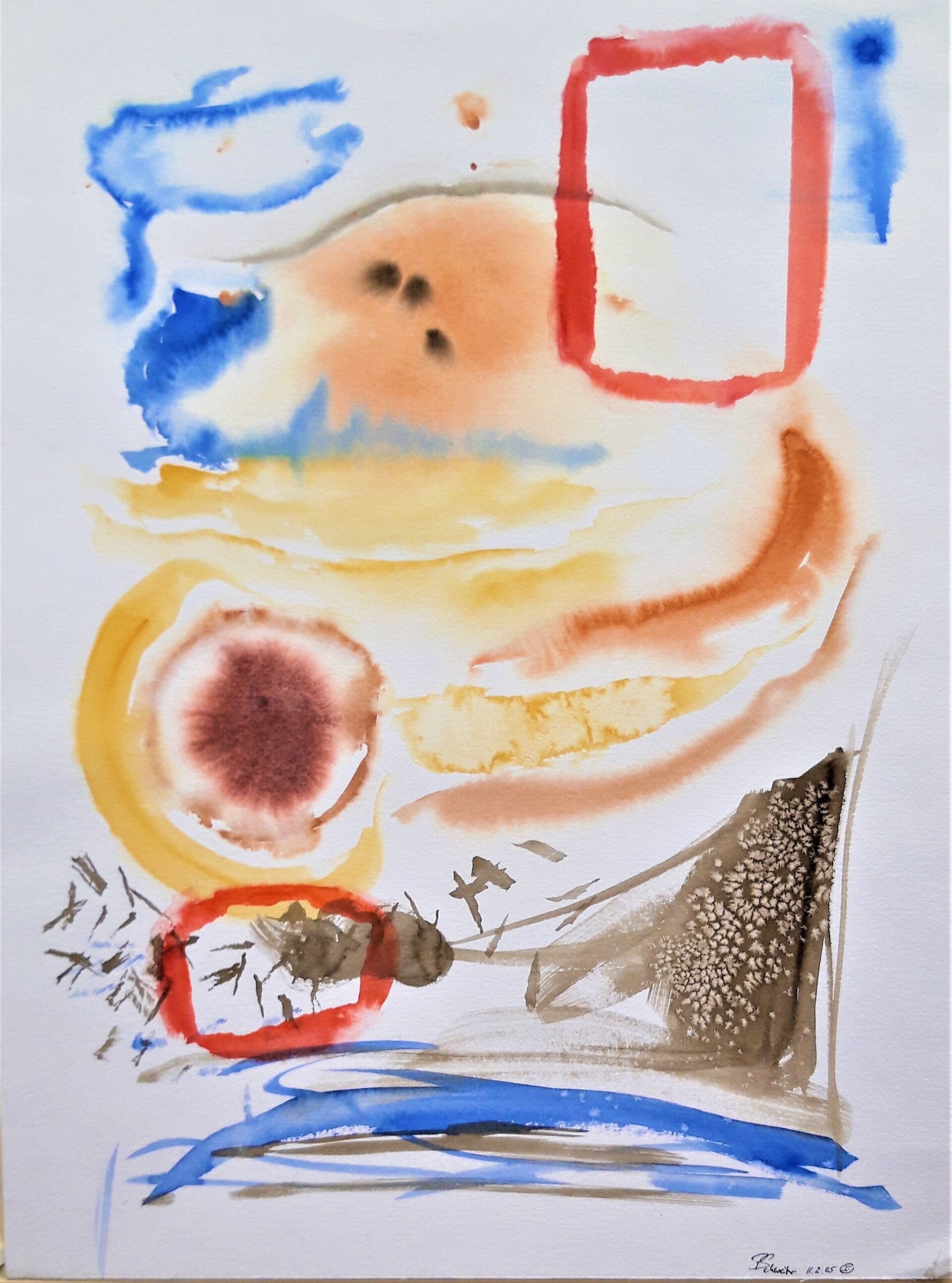 Sie überwand sich, und es liefen die Farben. Nach dem Trocknen der Aquarellfarben auf dem Aquarellpapier gab sich Ihrem Hinsehen mehr und mehr zu erkennen, was sich aus Erinnerungen bis dahin hat ergeben konnte.