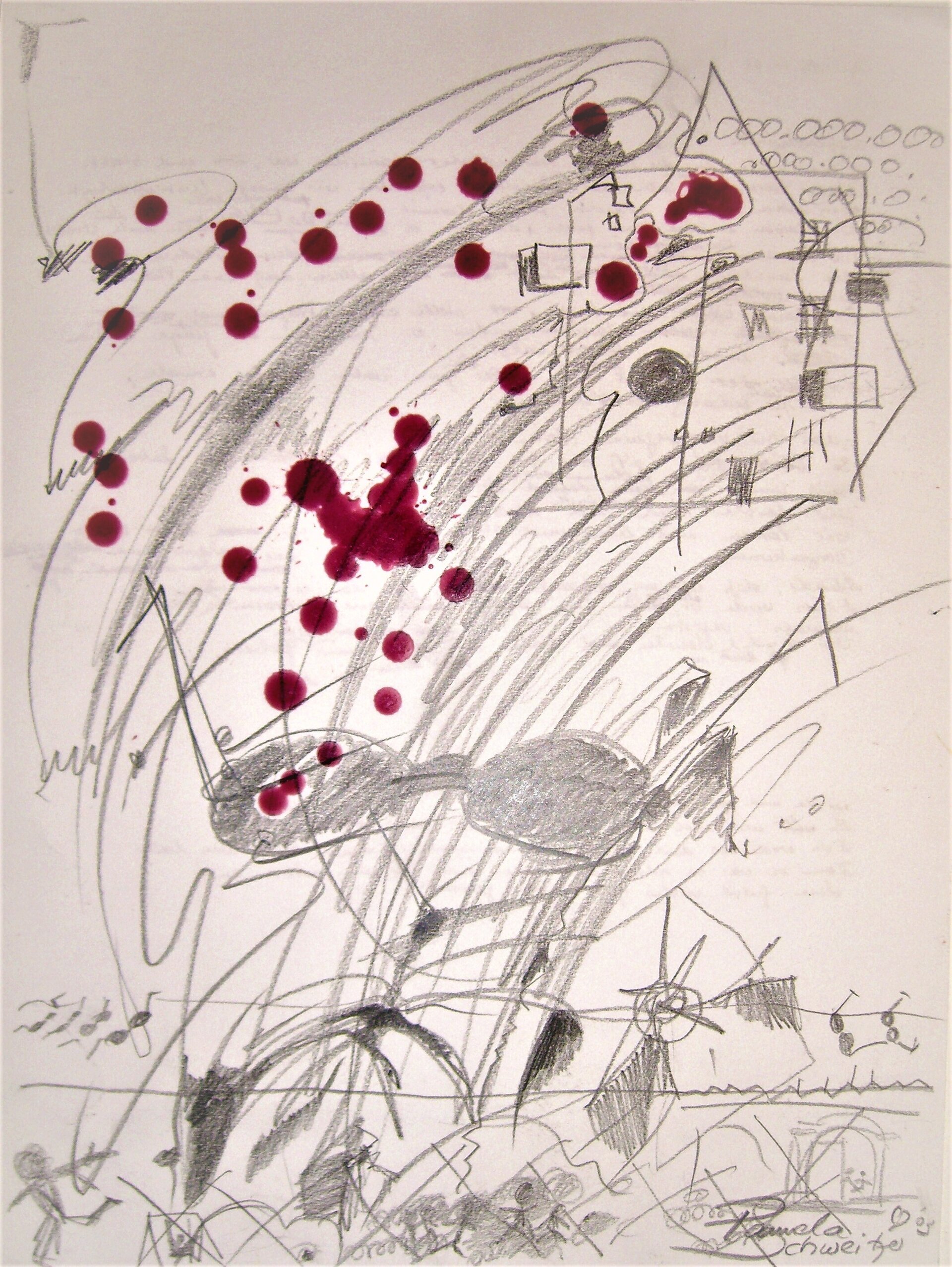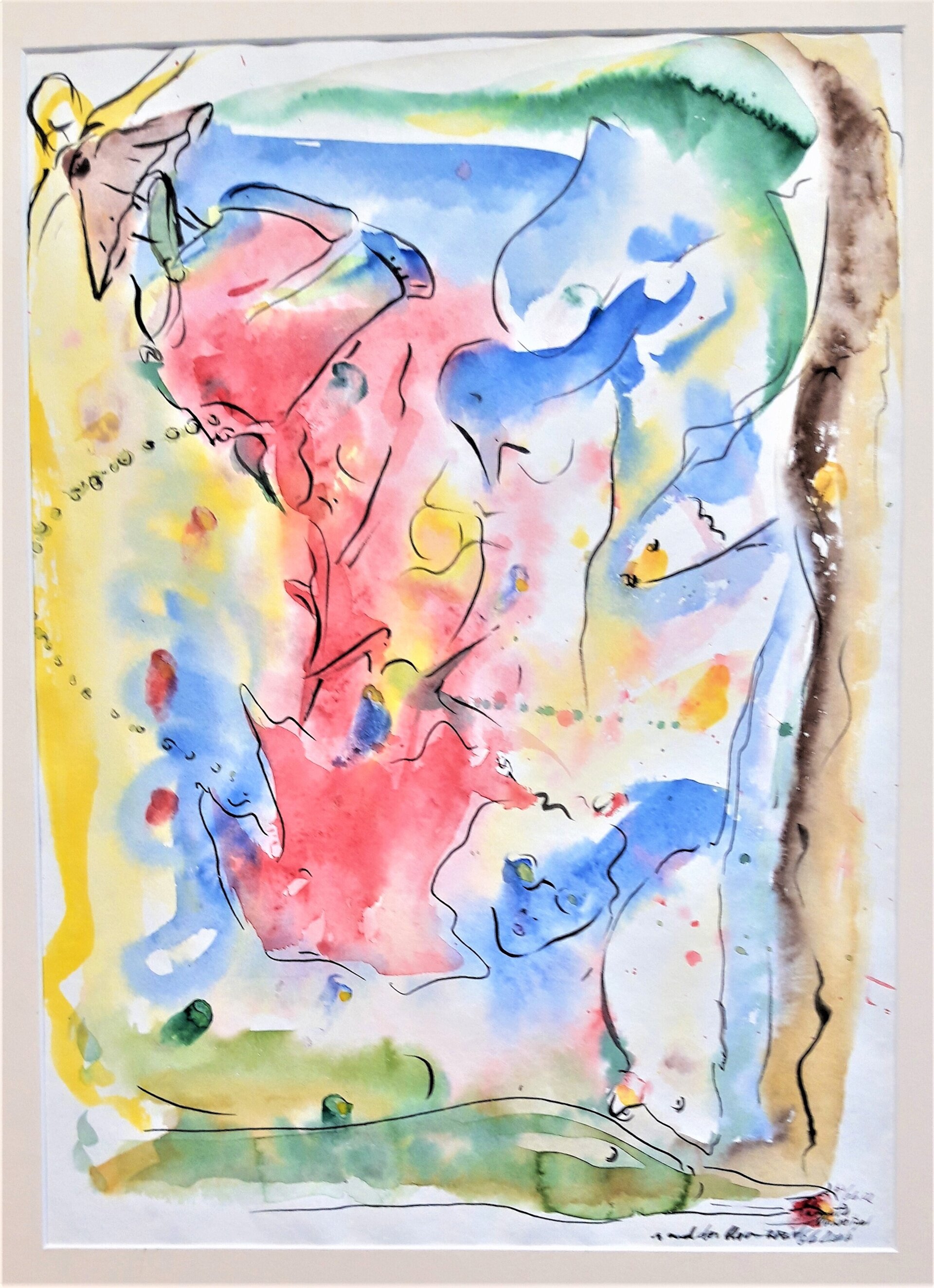 Sie probierte es ähnlich der Art in Görlitz und wollte wissen, ob sie sich auch zu dieser gegebenen Zeit allein zu Haus noch zu solcher Phantasie würde hinreißen lassen können. Es klappte. Angeleitet von Umständen der Freude an Musik, Tanz, Theater. Die Farben liefen ihre eigenen Wege, vermischten sich oder nicht. Nach dem Trocknen der Aquarellfarben auf dem Zeichenkarton gab sich Ihrem Hinsehen mehr und mehr zu erkennen, was sie an verschiedenes erinnerte. Linear umrandete Sie es mit Feder oder Grafikstift, wie es sich aus Erinnerungen bis dahin ergeben hatte können.